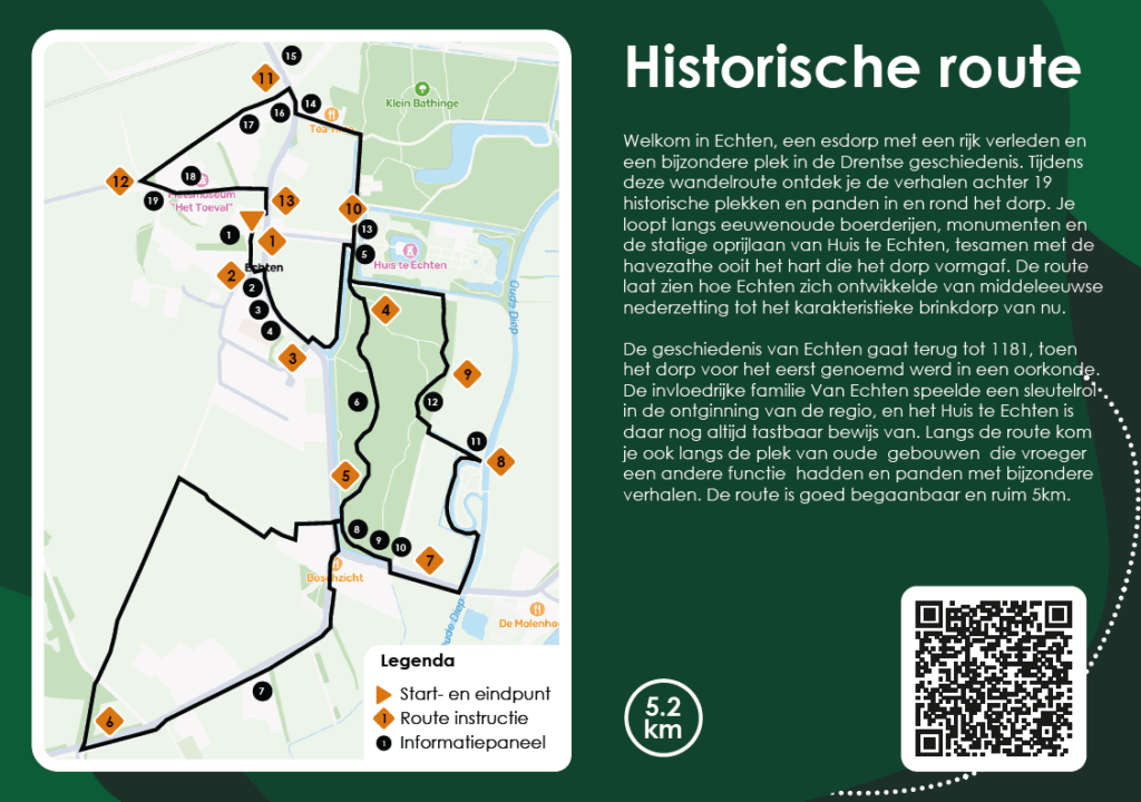 In echten kun je de historische wandelroute Echten volgen. De route is 5,2 km en daarmee prima te doen. Het is een route die de contrasten tussen arm en rijk laat zien, langs bij de oude kern van Echten, langs de 14e-eeuwse havezate Huis te Echten en de witte villa uit 1914. De geschiedenis van Echten gaat terug tot 1181, toen het dorp voor het eerst genoemd werd in een oorkonde. De invloedrijke familie Van Echten speelde een sleutelrol in de ontginning van de regio, en het Huis te Echten is daar nog altijd tastbaar bewijs van.